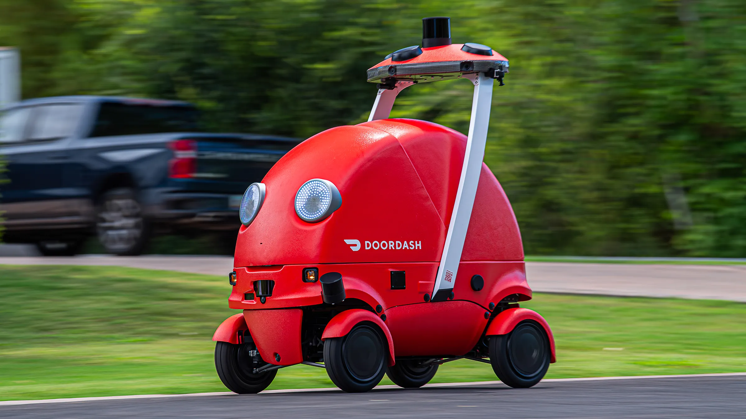 El nuevo robot de entrega de alimentos de DoorDash, llamado “Dot”, puede alcanzar velocidades de hasta 20 mph y viajar por calles, aceras y entradas de vehículos.
