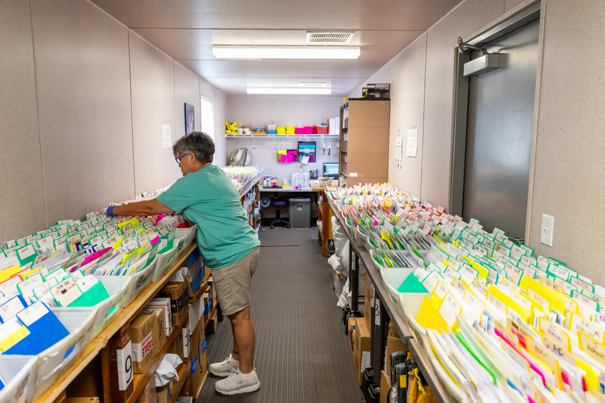 Un viernes reciente, ordenó meticulosamente las letras en contenedores ordenados alfabéticamente.